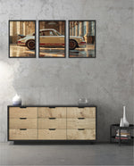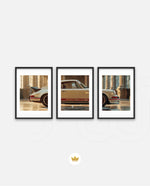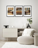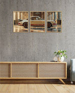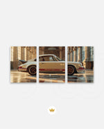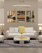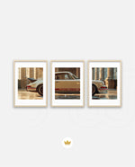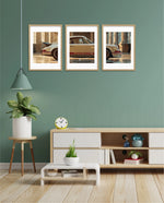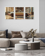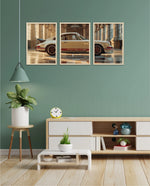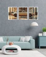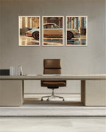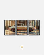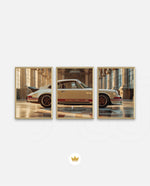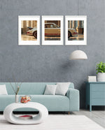 A classic cream sports car captured in a grand historic hall, designed as wall art prints and framed wall art for picture frames, photo frames, modern wall art, and elegant decorative wall pieces, ready to hang.