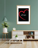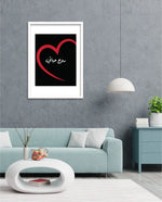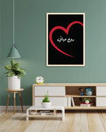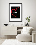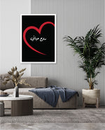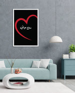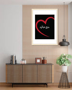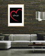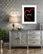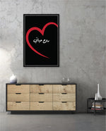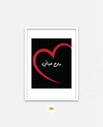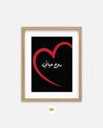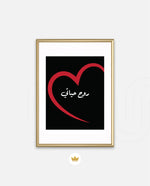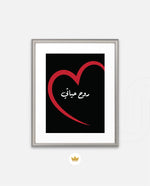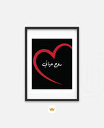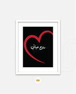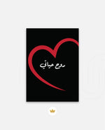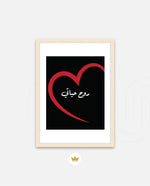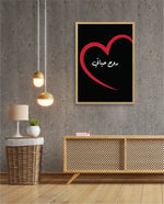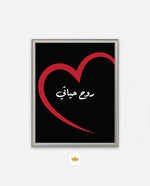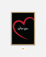 A deeply romantic Arabic calligraphy artwork featuring the phrase “Rooh Hayati,” meaning the soul of my life, expressed through elegant white script embraced by a flowing red heart on a dark background, symbolizing love, devotion, and emotional connection, ready to hang.