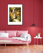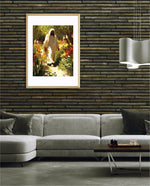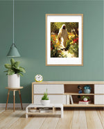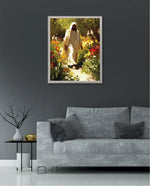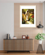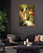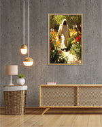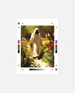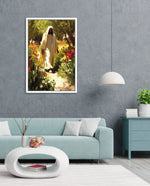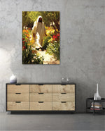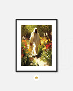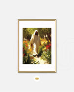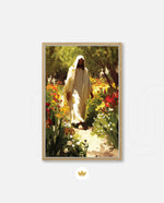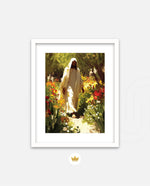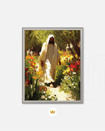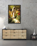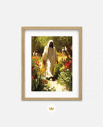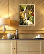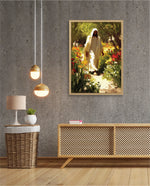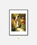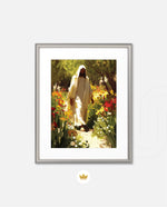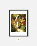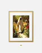 A divine figure walks gracefully through a radiant garden of flowers, symbolizing peace, purity, and spiritual light.