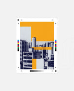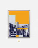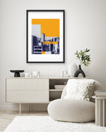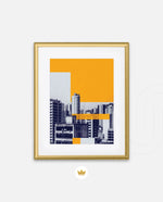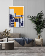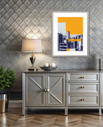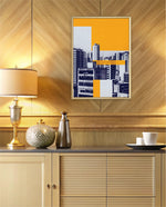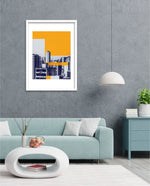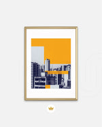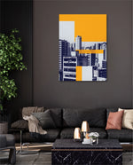Layered city forms in bold yellow and deep blue, created as wall art prints and framed wall art for picture frames and photo frames, adding creative wall decor as modern wall art for living room wall art and decorative wall pieces, ready to hang.