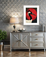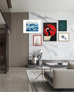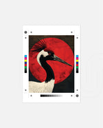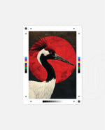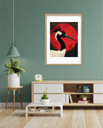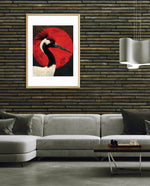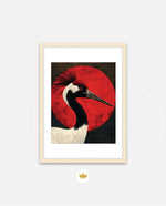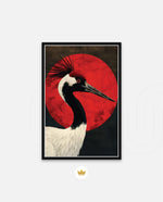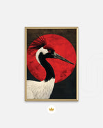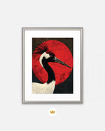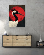A striking oriental-inspired artwork featuring a graceful crane set against a bold red sun, rendered with rich textures and dramatic contrast that symbolise longevity, strength, and quiet power, bringing a refined statement to modern and artistic interiors, ready to hang.