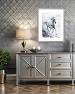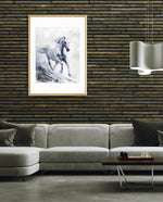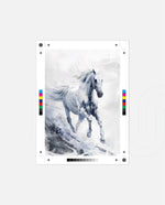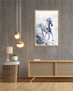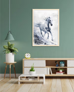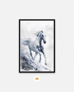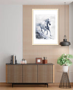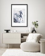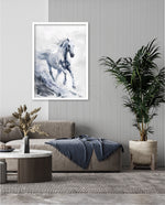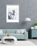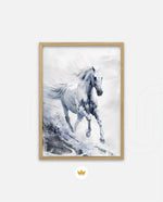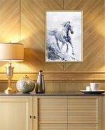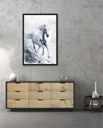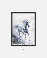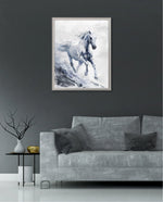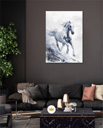 A powerful monochrome artwork capturing a majestic white horse in full motion, splashing through mist and snow with flowing mane and raw energy, symbolising freedom, strength, and elegance for bold modern wall spaces, ready to hang.