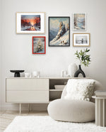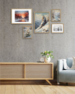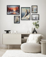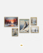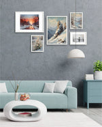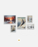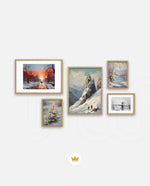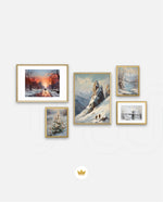 A winter art collection showing snowy paths, alpine peaks, frozen lakes, bridges, and frost-covered blooms, designed as wall art prints and framed wall art for picture frames, photo frames, modern wall art, and decorative wall pieces, ready to hang.