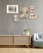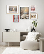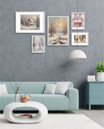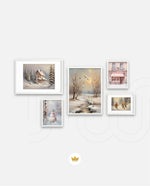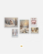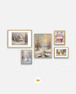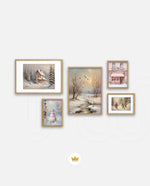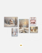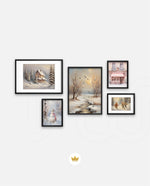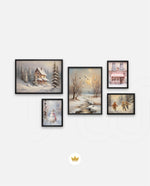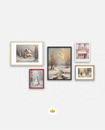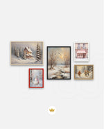 A cozy winter collage featuring snowy cottages, forest paths, birds, and playful children, created as wall art prints and framed wall art for picture frames, photo frames, modern wall art, and decorative wall pieces, ready to hang.
